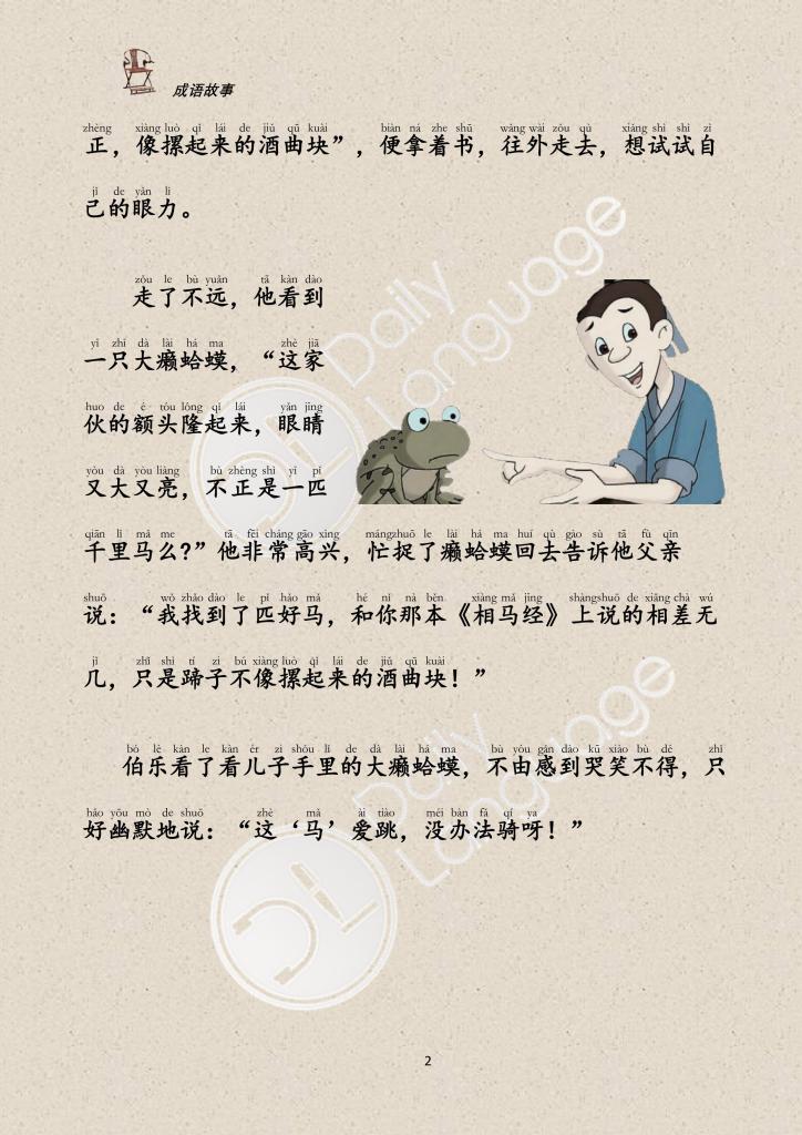 Bo Le wrote a book entitled The Art of Looking at Horses and Judging Their Worth, based on his experiences and knowledge accumulated over the years. The book was also illustrated with the pictures of various horses. Bo Le had a son who thought it was very easy to appraise horses according to the book. So he took it with him to look for fine horses. He found the characteristics of a toad fit very well the characteristics described in the book. So he happily took the toad back home, Bo Le did not know whether he should laugh or cry. “That is just what we call looking for a steed with the aid of its picture.”