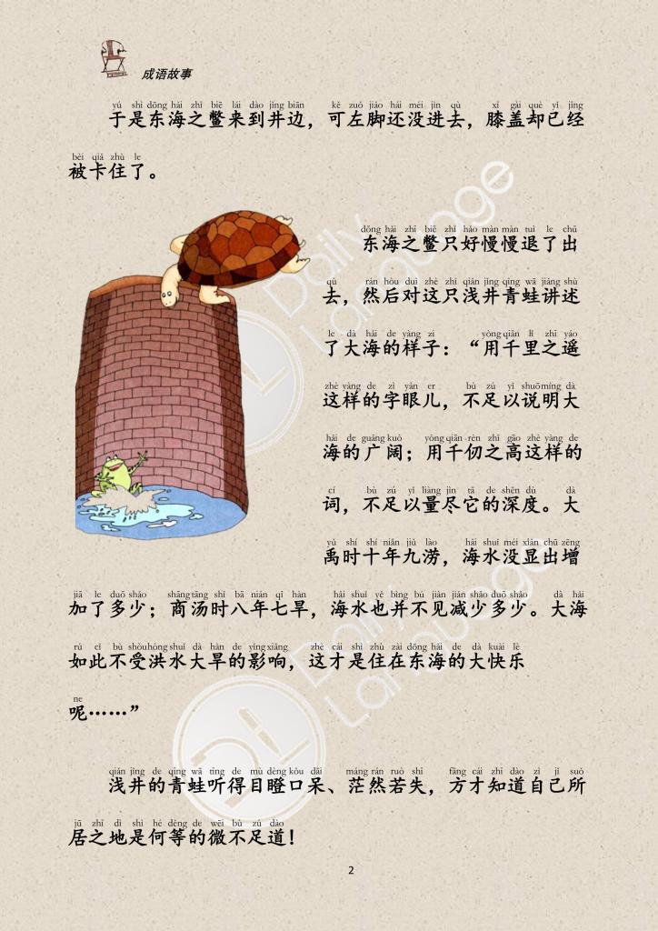 Before the turtle from the East Sea could get its left foot in the well, its right knee got stuck. It hesitated and retreated. The turtle told the frog about the East Sea.