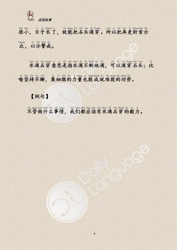 shuǐ dī shí chuān,意思是指水滴不断地滴,可以滴穿石头;比喻坚持不懈,集细微的力量也能成就难能的功劳 。