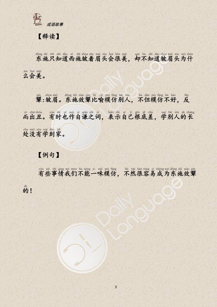 dōng shī xiào pín,比喻模仿别人,不但模仿不好,反而出丑。有时也作自谦之词,表示自己根底差,学别人的长处没有学到家。