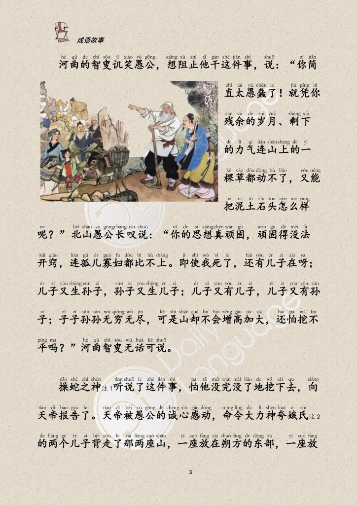 In ancient times, there was an old man named Yu Gong. He was nearly 90 years old. There were two mountains in front of his house. One was the Taihang Mountain, the other the Wangwu Mountain. It was very inconvenient for people to come and go.