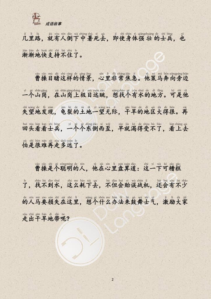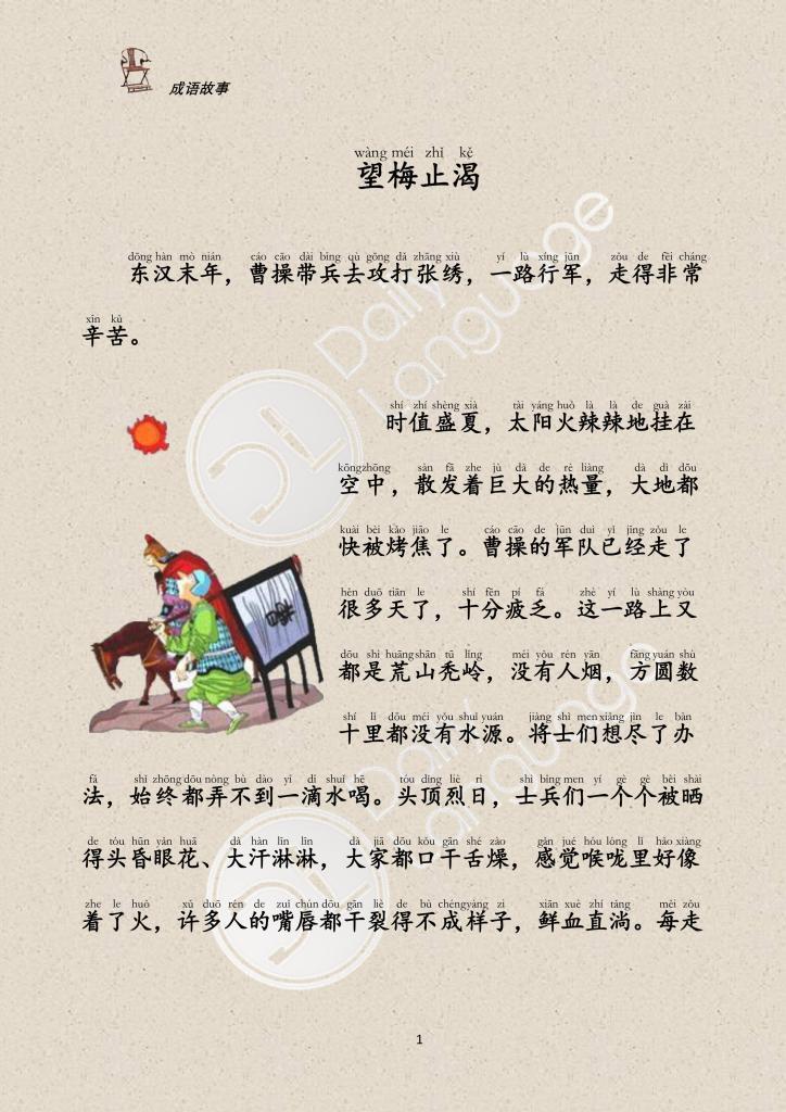 One summer, Cao Cao was leading his troops in a punitive expedition against Zhang Xiu. It was extraordinarily hot. The burning sun was like a fire, and the sky was cloudless. The soldiers were walking on the winding mountain paths. The dense forest and the hot rocks exposed to the sun on both sides of the paths made the soldiers feel suffocated. By noontime the soldiers’ clothes were wet through with sweat, and the marching speed slowed down. Some solders of weak physique even fainted on the roadside.