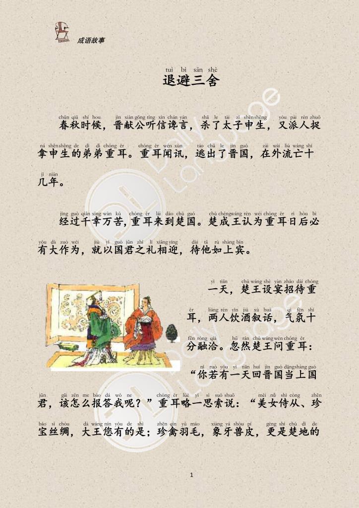 One day, King Cheng of the State of Chu gave a banquet in honor of Chong Er. Suddenly, amid the harmonious atmosphere of drinking and talking, King Cheng of the State of Chu asked Chong Er. “How will you repay me when you return to the State of Jin and become its ruler one day?” After thinking for a moment, Chong Er said, “You have plenty of beauties and attendants as well as jewelry and silk cloth, and the state of Chu abounds in rare brides and animals. What treasure can the State of Jin boast having to present to your majesty?” King Cheng of the State of Chu said, “You are too modest. Nevertheless, you still have to show your gratitude to me in one way or another, I presume?” Smiling, Chong Er answered, “If I should be fortunate enough to return to the State of Jin and become its ruler, the State of Jin would be friendly to the State of Chu. If, one day, there should be a war between the two states, I would definitely order my troops to retreat three SHE (one SHE is equivalent to thirty LI. The LI is a Chinese unit of length equivalent to 1/2 kilometer. And, therefore, three SHE is about thirty miles.) as a condition for peace. If, under that condition, you were still not reconciled, I would have to fight with you.”