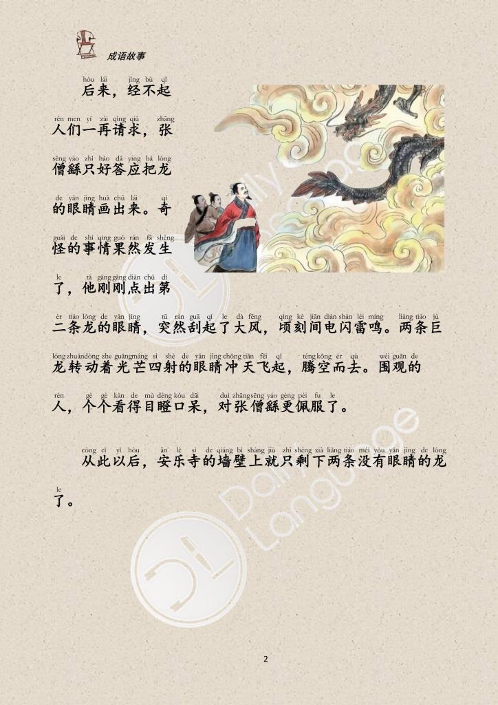 Nobody believed this, so Zhang Sengyao took up his brush and added eyes to two of the dragons. No sooner had he finished than the two dragons flew into the sky amid a thunderstorm. The two without eyes stayed painted on the wall.