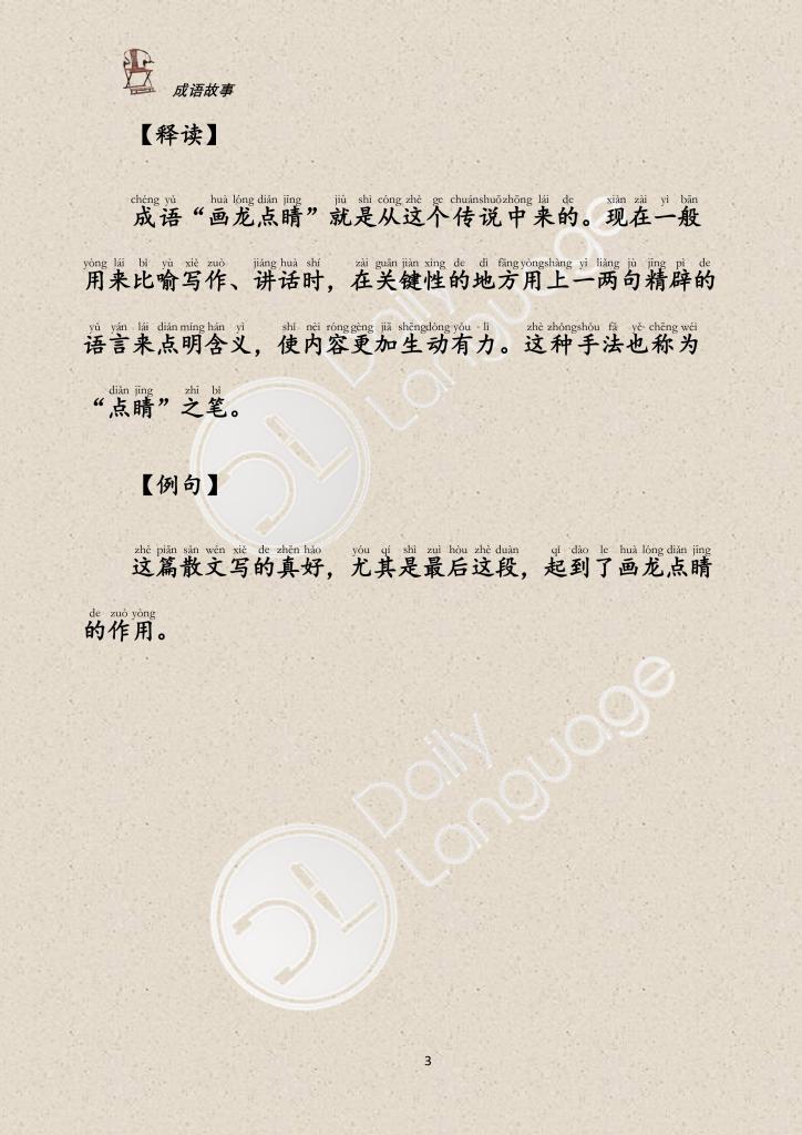huà lóng diǎn jīng,“画龙点睛”原先是形容梁代画家张僧繇作画的神妙,后多比喻写文章或讲话时,在关键处用几句话点明实质,使内容更加生动有力。