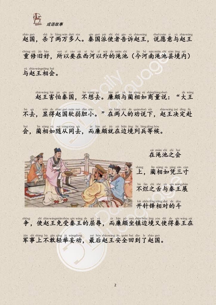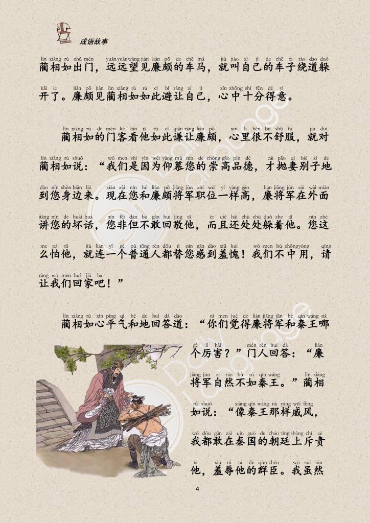 Lin Xiangru heard about something which Lian Po said, who then avoided meeting Lian Po on purpose. However, the men of Lian Po became more aggressive and audacious. When people asked Lin Xiangru whether he was afraid of Lian Po, he answered with a smile: “How am I supposed to fear General Lian Po when I am not afraid of the king of Qin? It is because of the unity among the officials of Zhao that Qin can find no opportunity to attack our state. If I get into conflict with General Lian Po, it would allow opportunity for the Qin to wage their attack, and our state would be in great danger. I shouldn’t sacrifice the future of my country for personal dignity.”