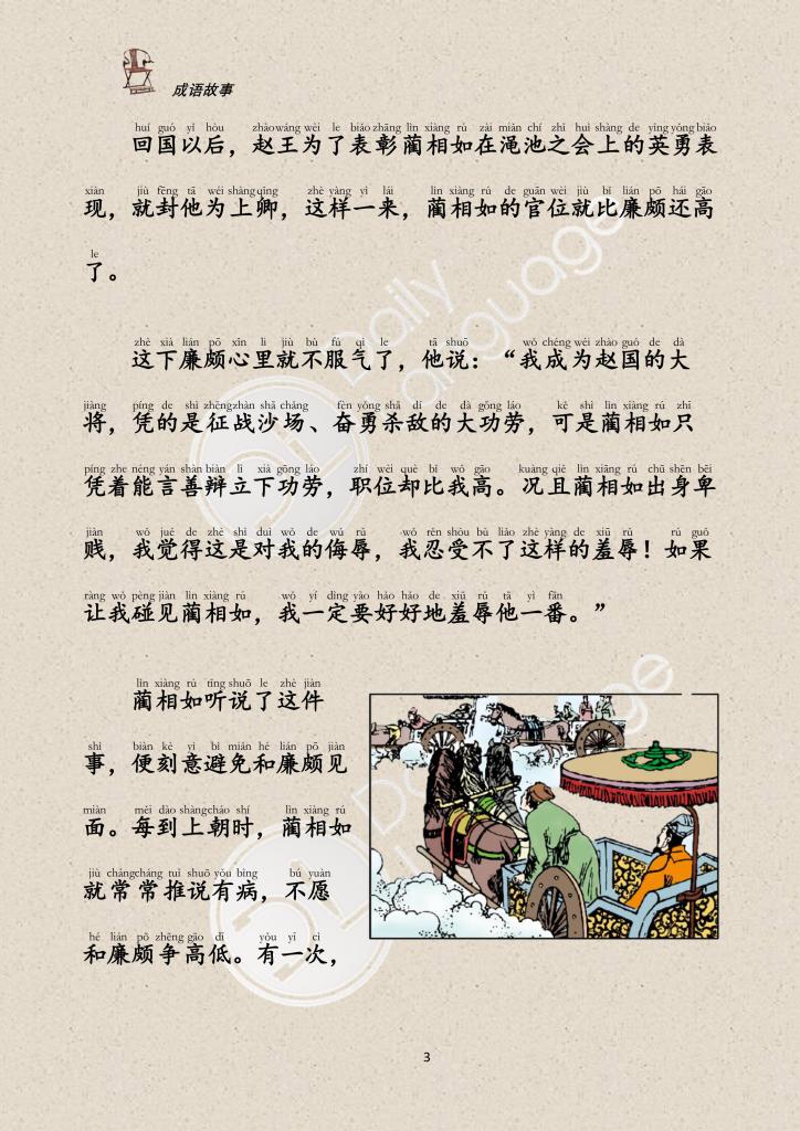 At the time there was a man in the State of Zhao named Lin Xiangru, who was wise and courageous. He fought hard for the dignity of his state when he participated in the negotiation with Qin as a diplomatic envoy. The king of Zhao gave him a position of authority due to his excellent contributions, which annoyed the general Lian Po, who thought defiantly: “I have fought in so many battles to defend the state. Compared with my feats, Lin Xiangru’s work of simply a few words amounts to nothing at all. Why should he take a position higher than me?” The more he thought about it, the more he got irritated. He said in public that he would disgrace Lin Xiangru in person.