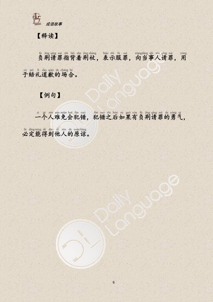 fù jīng qǐng zuì,意思是背着荆杖,表示服罪,向当事人请罪,用于赔礼道歉的场合。