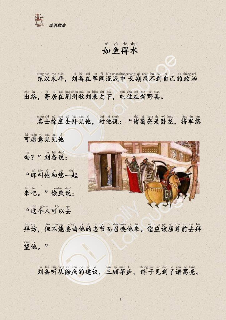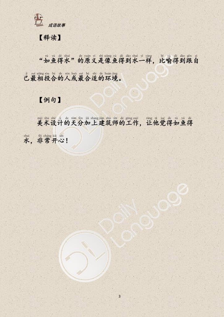 [rú yú dé shuǐ],“如鱼得水”的原义是像鱼得到水一样,比喻得到跟自己最相投合的人或最合适的环境;也比喻有所依靠。