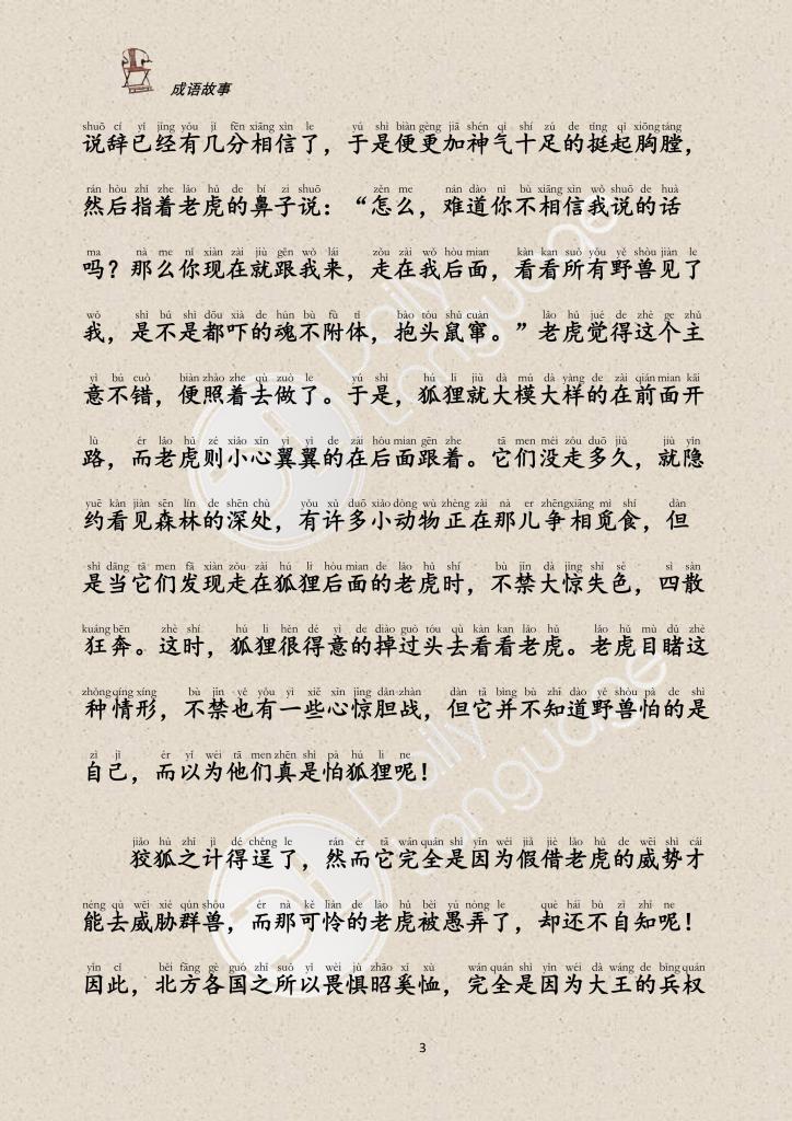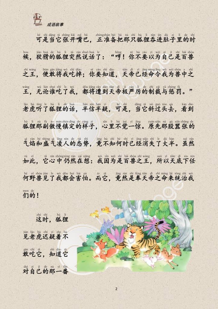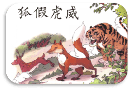 A tiger caught a fox in a forest, and was just about to eat it, when the fox said, “You mustn’t eat me. I was sent by Heaven to rule the animals. By eating me, You will violate the command of Heaven. If you don’t believe me, just follow me to see whether the animals are afraid of me.”