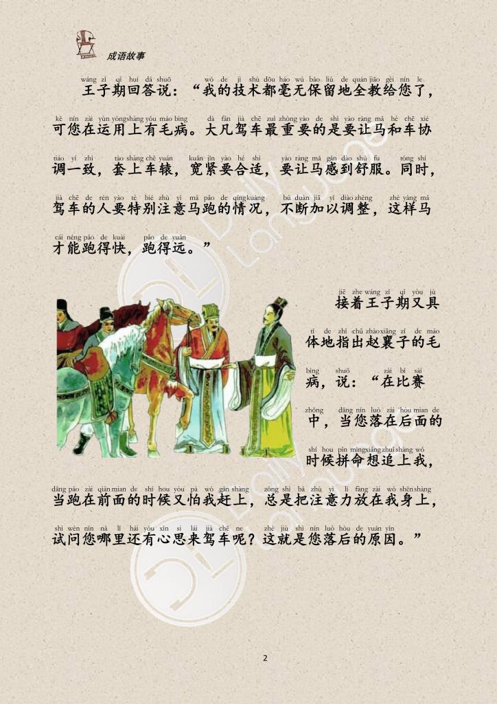 Wang Yuqi said, “The most important thing in driving a chariot is to coordinate the body of the horse with the chariot and pay all your attention to controlling the horse. Now when you lagged behind, you just wanted to keep up with me. When you were in the lead, you were afraid of being caught up by me. In a driving contest, there is always someone who lags behind, and someone who is in the lead. If you pay all your attention on me, how could you control your hoarse well? This is the reason why you lost.”