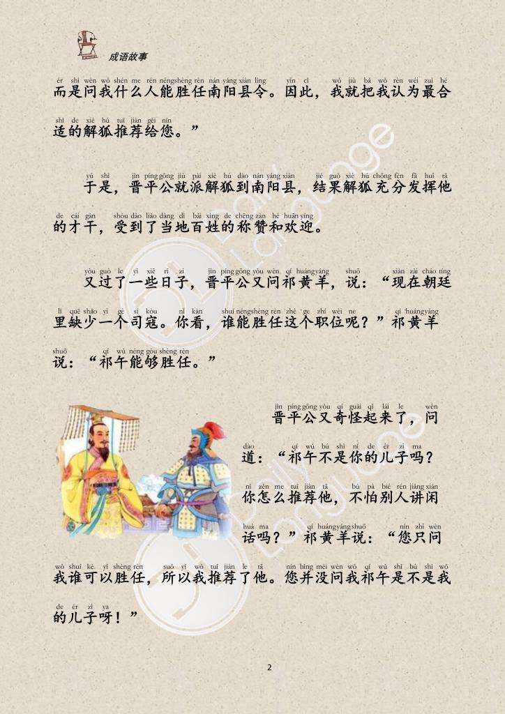 Some days later, the king again asked Qi Huangyang for his opinions. This time, the king was trying to find a suitable candidate for a court judge position. Qi Huangyiang recommended Qi Wu for the job. Once again, the king was surprised again by the recommendation because Qi Wu was the son of Qi Huangyang. The king asked: “Who do you recommend your son? Aren’t you afraid people will gossip?”