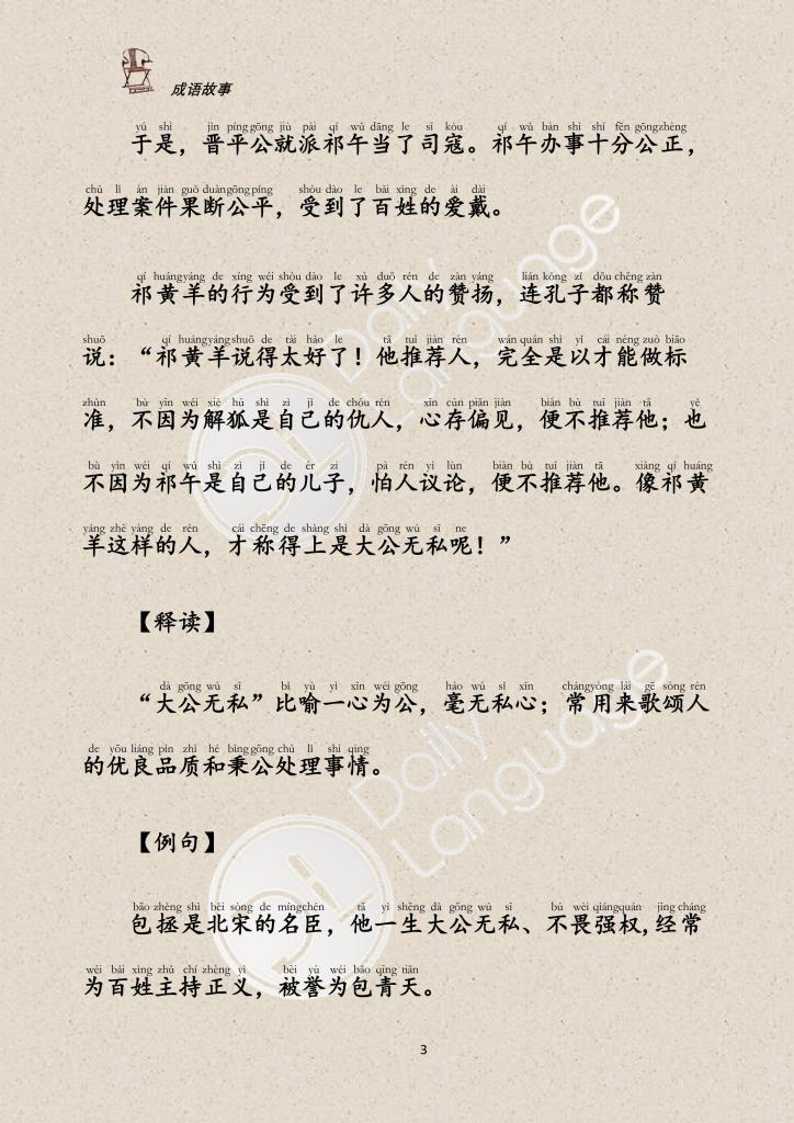 From Confucious’ comment came the idiom “Unselfish”. Anyone who handles affairs fairly and impartially can be described as “Unselfish; Perfectly impartial”.