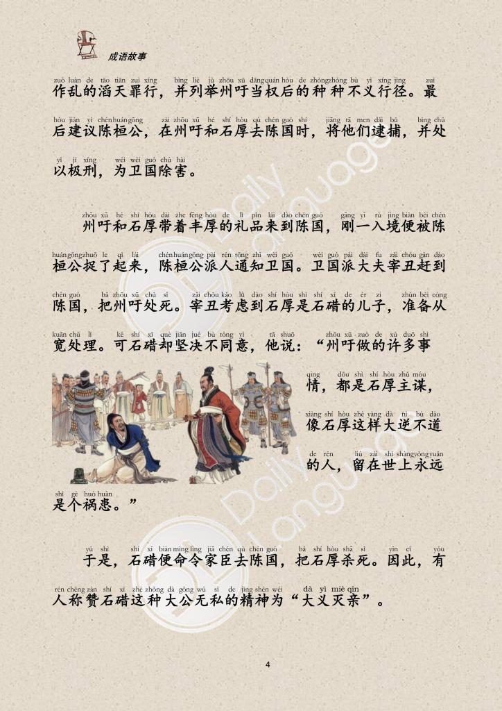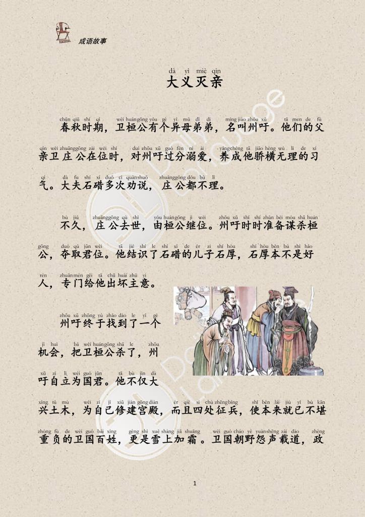 As soon as Zhou Xu and Shi Hou arrived in the Dukedom of Chen, they were arrested. Some officials from Wei made a special trip to Chen to kill the two men. They put Zhou Xu to death but hesitated to kill Shi Hou because of his father. When the old man learnt about this, he said firmly :’My son has also committed the murder of the duke. What’s the good to have him in the world!” he sent his own man to Chen and beheaded Shi Hou. Later historians commented: “To safeguard the interest of the country, Shi Que did not bend the law for the benefit of his relative. It’s really a case of cutting off consanguinity for the sake of righteousness!” Hence comes the idiom “Uphold justice at the cost of one’s blood relation”.