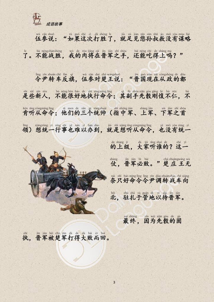 The Jin general, Xian Lin Fu, ignored his command and attacked the state of Chu on his own. Wu Can, the official of the state of Chu, told King Zhuang of Chu, “The Jin army will be far ahead of the others. The army will be disunited, and we can launch a campaign to destroy Jin.”