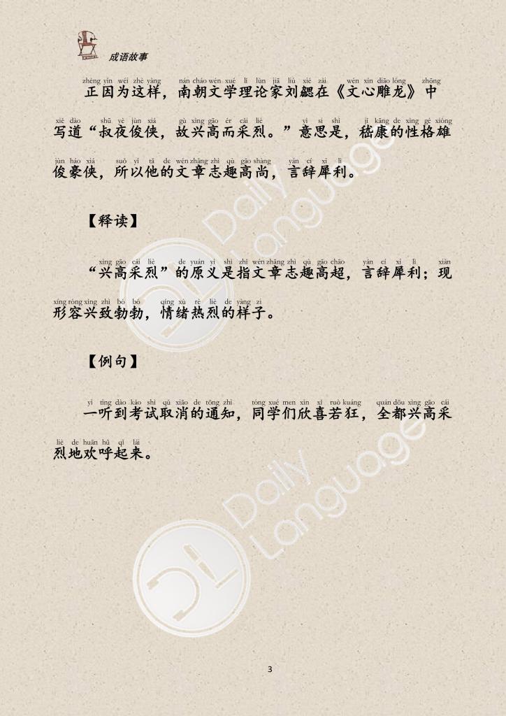 [xìng gāo cǎi liè],原义是指文章旨趣高超,辞采峻切犀利;形容兴致勃勃,情绪热烈的样子。