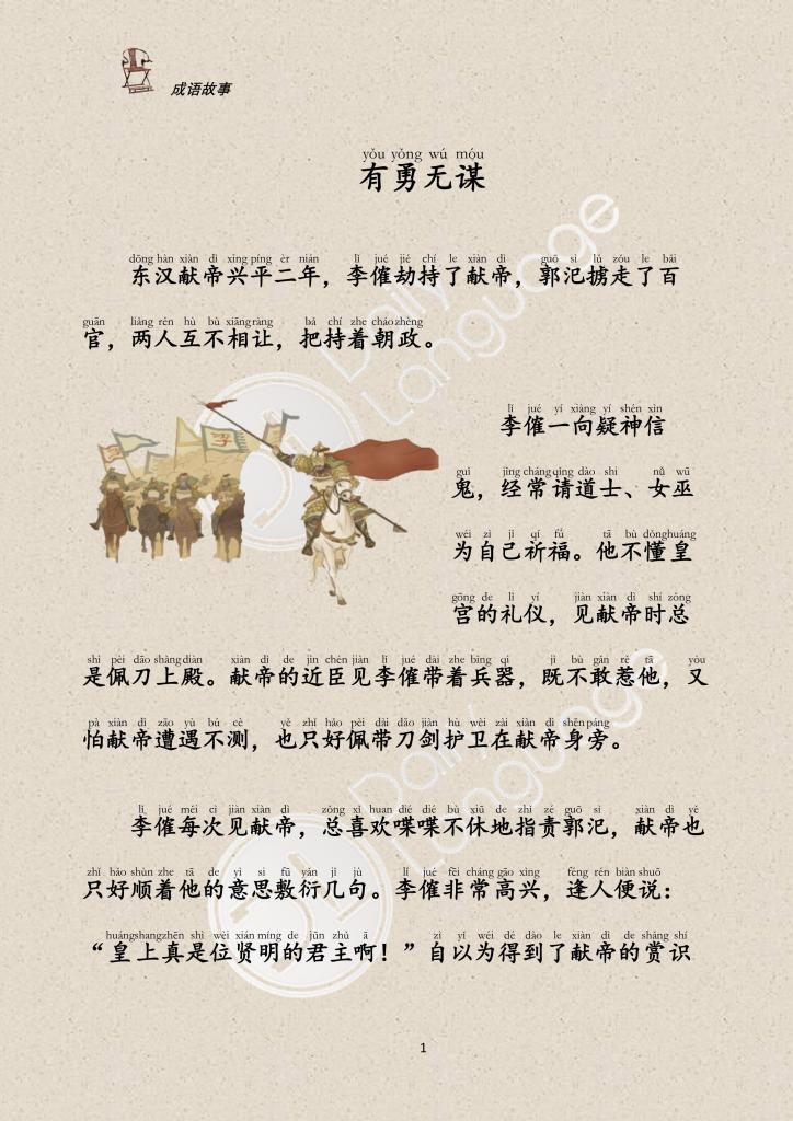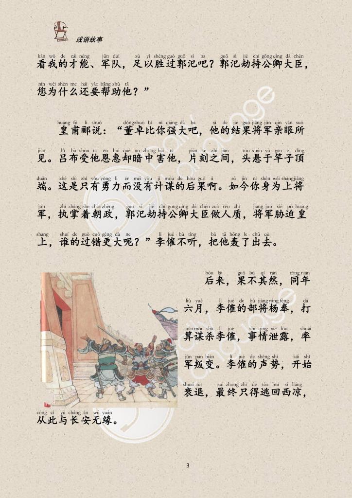 Huang Fuli said, “Dong Zhuo is stronger than you. Lu Bu received his favor but secretly killed him. That’s what happens when you have courage and no strategy. You and Guo Si have taken the Emperor and the officials hostage. Who is more guilty?” Li Jue wouldn’t listen and threw him out.