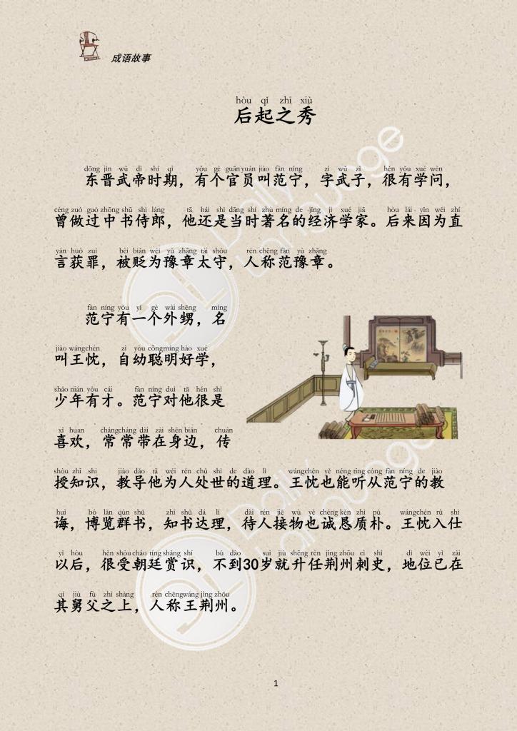 In the Eastern Jin Dynasty, Wang Chen showed his talent as a teenager and was highly appreciated by his friends and relatives. His uncle Fan Ning, a famous scholar at that time, also held Wang Chen in high regard. When famous scholars visited him, he would always let Wang Chen be present to receive him.