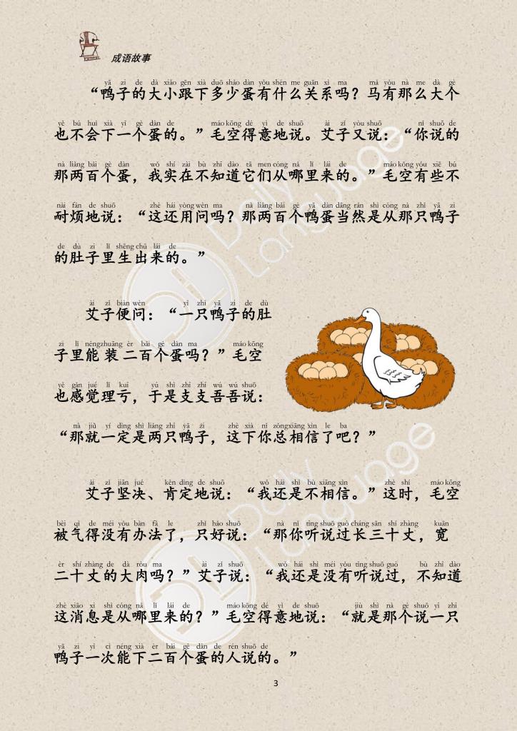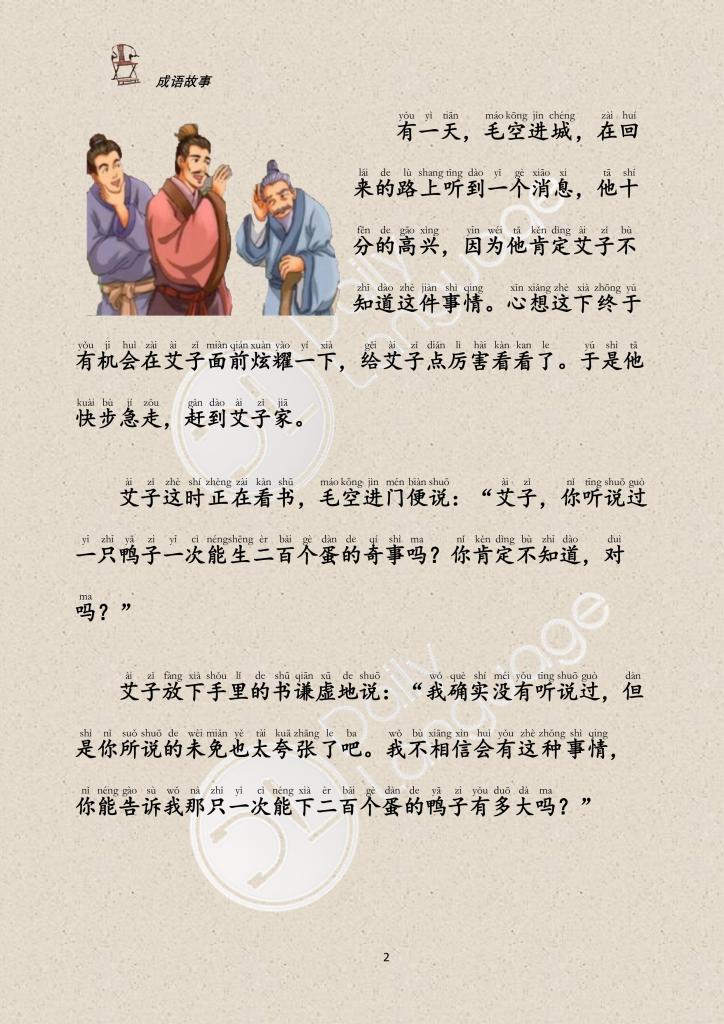 One day, Mao Kong told Ai Zi: “A duck lays a hundred eggs at a time”. Ai didn’t believe it. Mao Kong said, “It was born from two ducks.” Aiko still doesn’t believe it. Mao Kong then told Ai Zi, “Do you believe there is a piece of meat that is thirty feet long and twenty feet wide?” Ai Zi still didn’t believe it.