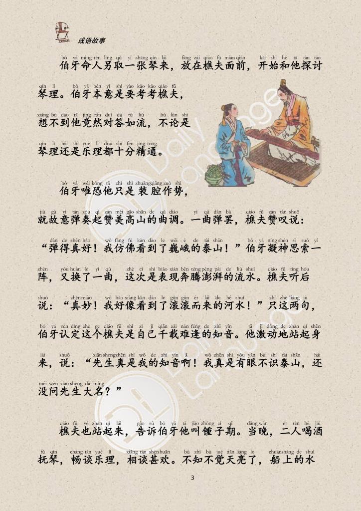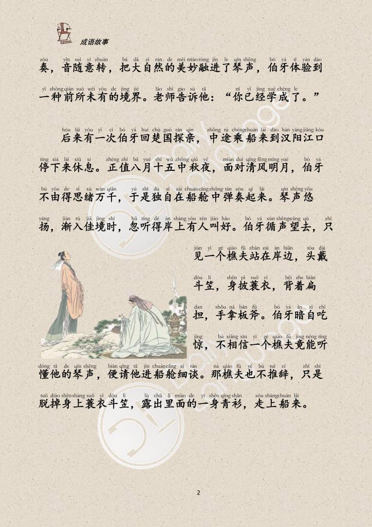 Once, a boat trip to Boya. Facing the breeze and the bright moon, his mind was full of thoughts, so he began to play the guqin again, and the sound was melodious. Suddenly heard a shout from the shore. Hearing the sound, Boya got out of the boat and saw a woodcutter standing on the bank. He knew that this man was a good friend and immediately asked the woodcutter to get on board and played for him with great enthusiasm. When Boya played a song of praise for the mountains, the woodcutter said, “Good! Majestic and solemn, like the towering Mount Tai!” When he played to represent the surging waves, the woodcutter said, “Good! Broad and vast, like seeing rolling water, boundless sea general!” Boya was excited and said excitedly, “Bosom friend! You are my bosom friend.” The woodcutter was Zhong Ziqi. The two became very good friends and agreed to meet again the following year.