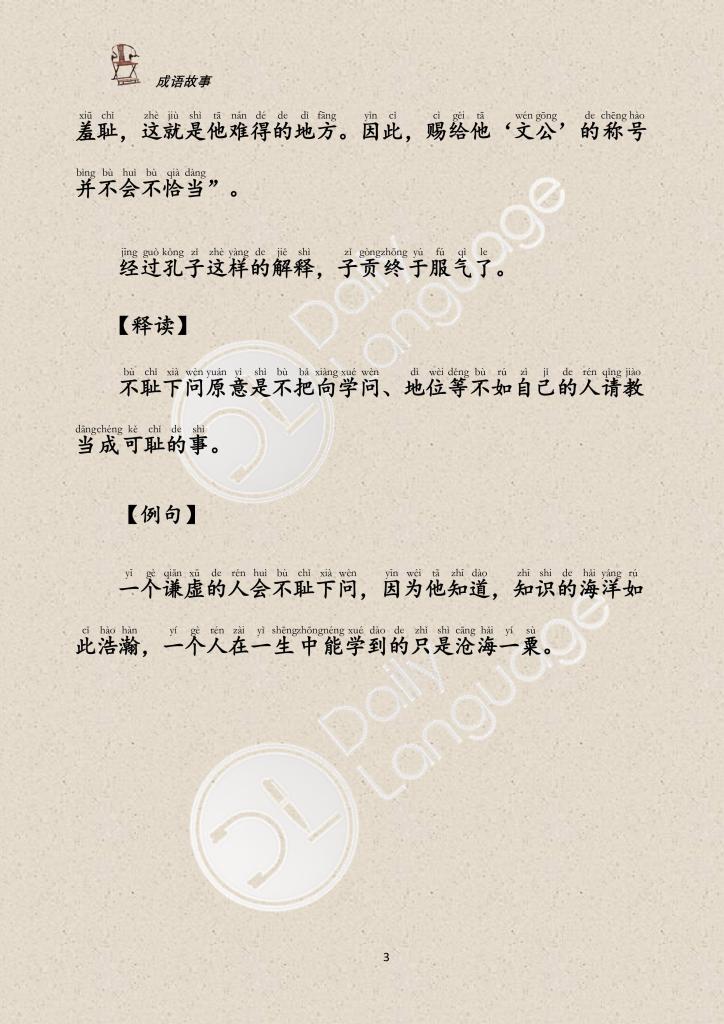 One of Confucius’ students, Zi Gong, was also a man of Wei . He was not convinced that Kongyu was worthy of such a high honor. Once Zi Gong asked Confucius, “Sir, Kongyu is indeed very high in knowledge and talent, but there are many others more outstanding than him. Why should he be given the title of ‘Lord Wen’?” The Confucius answered with a smile, “Kongyu was very diligent and studious, clever and agile, and if he did not understand anything, even if the other person was not in his position or knowledge, he would be generous and modest to ask for advice, and would not be ashamed of it. Therefore, it would not be inappropriate to give him the title of ‘Lord Wen’.”