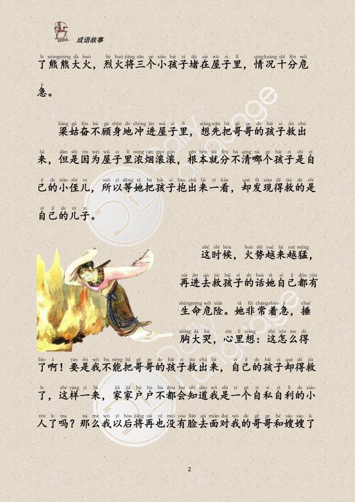 Liang Gu rushed into the house and took the child out to take a look, but found that it was her son who was saved. At this time, the fire became more and more fierce, and if she went in to save the child, her own life was in danger. She was very anxious, thinking to herself: If I can’t save my brother’s child, but my own child is saved, won’t everyone know that I am a selfish person? she once again rushed into the burning house, but the child was not rescued, and she herself was burned to death.